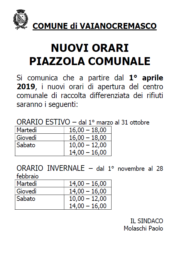 Si comunica che a partire dal 1° aprile 2019, i nuovi orari di apertura del centro comunale di raccolta differenziata dei rifiuti saranno i seguenti: