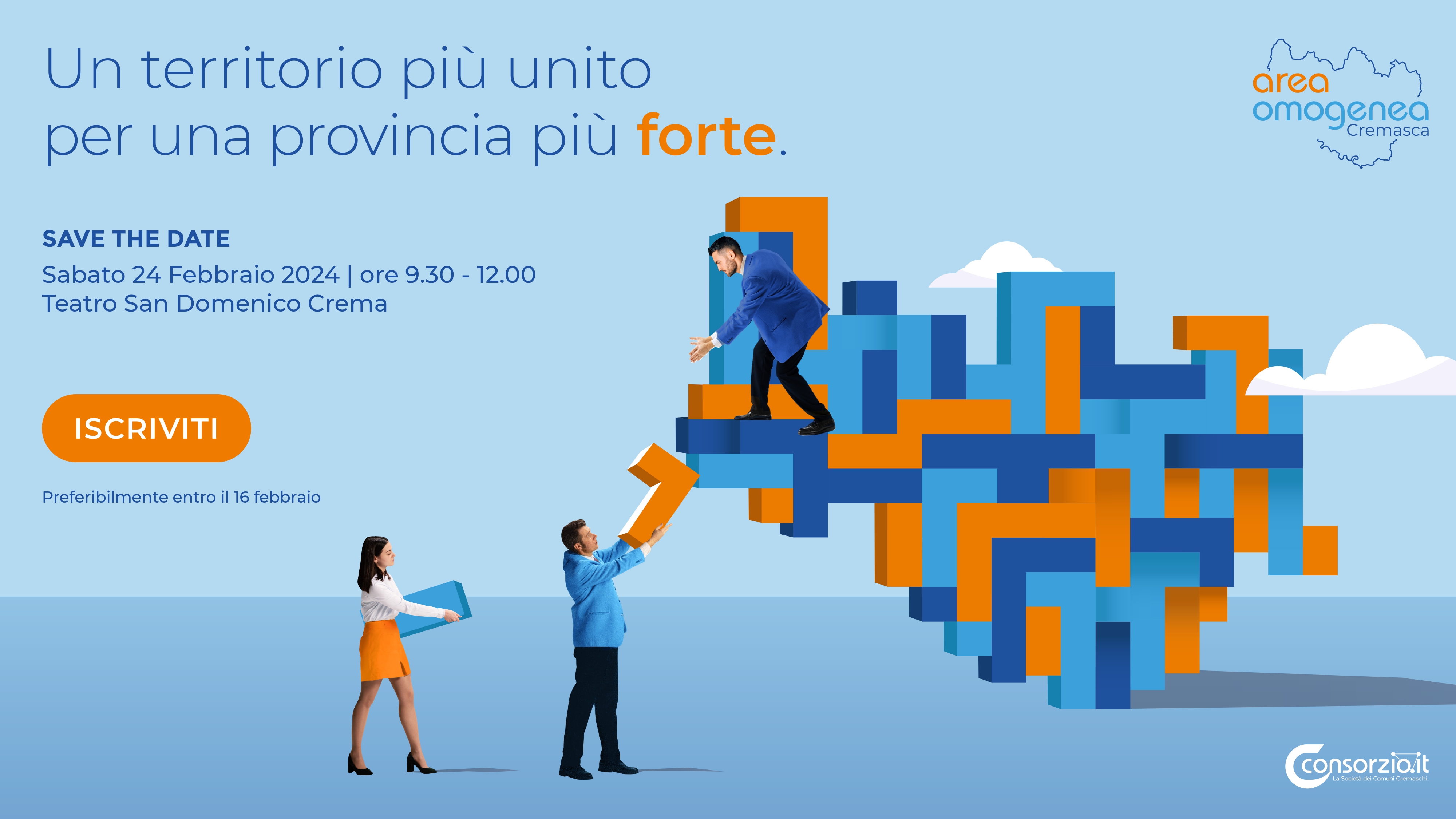 In riferimento all' Evento dell’Area Omogenea Cremasca in programma per il giorno 24.02 dalle ore 09.30 alle 12.00 presso il Teatro San Domenico, si informa che l’invito alla partecipazione è rivolto a tutti gli Amministratori del territorio (Sindaci, Assessori e Consiglieri Comunali)", ma è aperto a chiunque abbia interesse a partecipare, senza alcun obbligo di iscrizione.