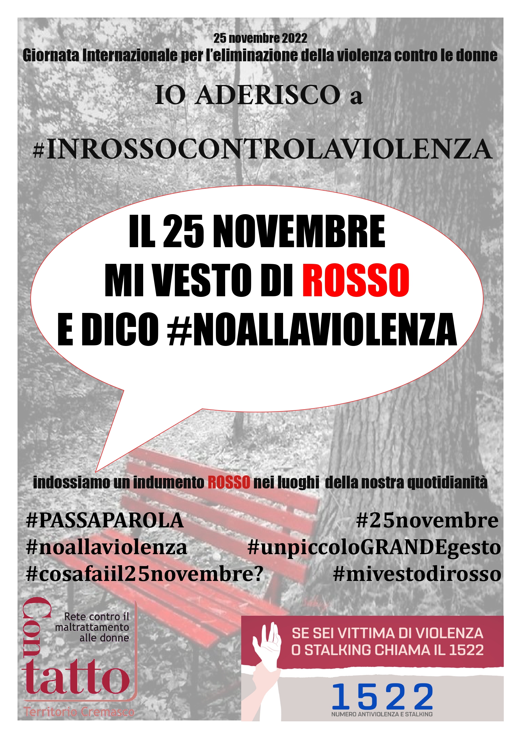 #INROSSOCONTROLAVIOLENZA promossa dalla rete Contatto, di cui codesto Comune, in quanto componente dell’Ambito, fa parte, programmata in occasione del 25 Novembre – giornata proclamata dall’ONU “Giornata Internazionale contro la Violenza sulle donne”;